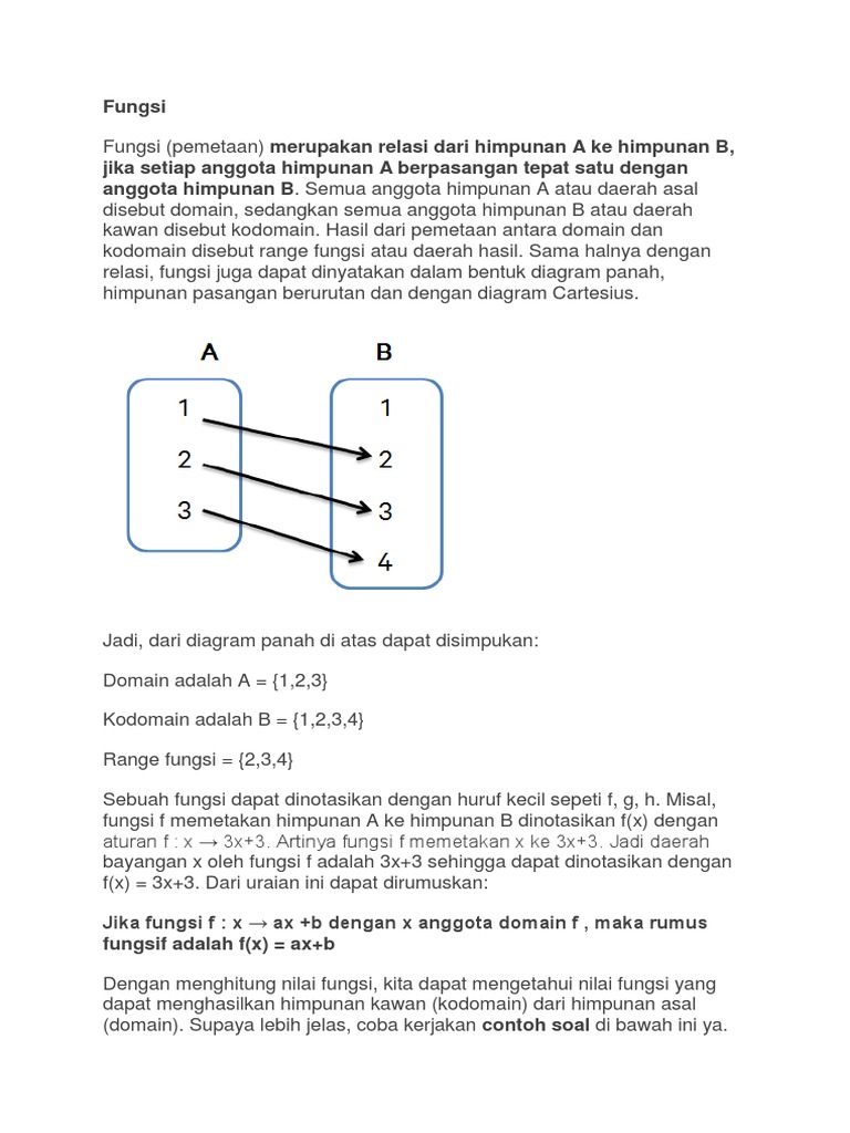 Fungsi merupakan relasi dari himpunan A ke himpunan B, jika setiap anggota himpunan A berpasangan tepat satu dengan anggota himpunan B
