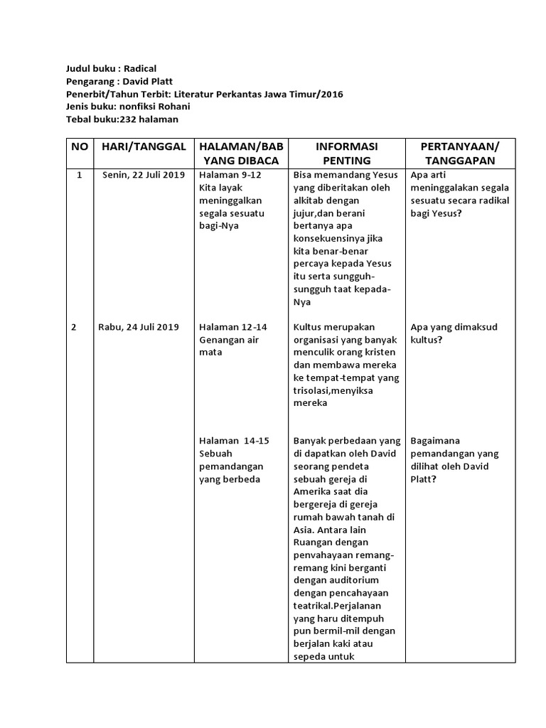 No Hari/Tanggal Halaman/Bab Yang Dibaca Informasi Penting …
