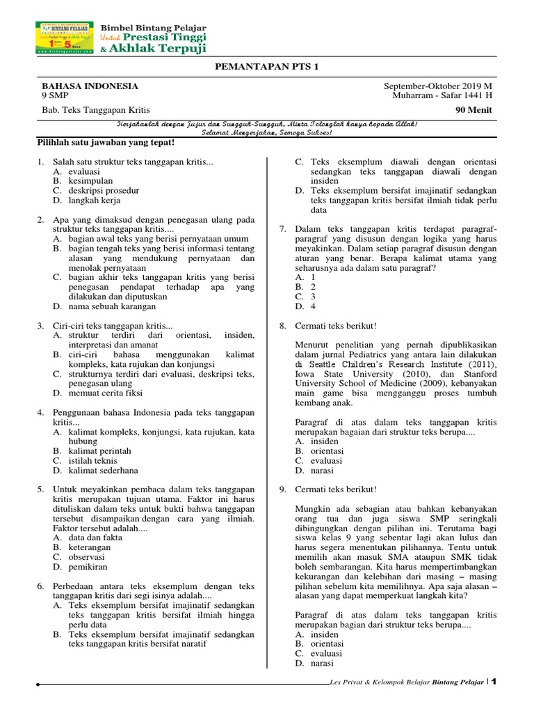 PM PTS 1 SMP Kelas 9 Bahasa Indonesia (Teks Tanggapan Kritis)