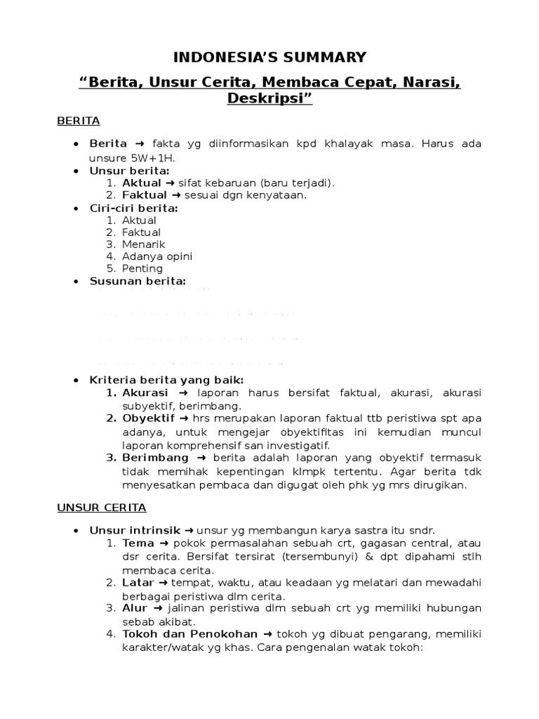 Summary - Berita, Unsur Cerita, Membaca Cepat, Narasi, Deskripsi