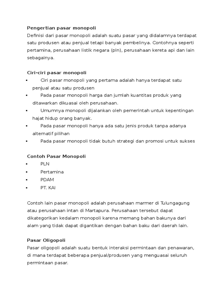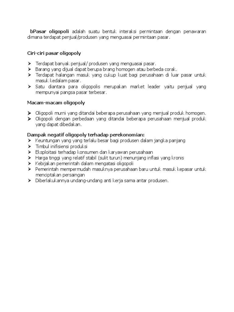 Ciri ciri pasar oligopoli antara lain 1 ada beberapa penjual di pasar 2 barang | Course Hero