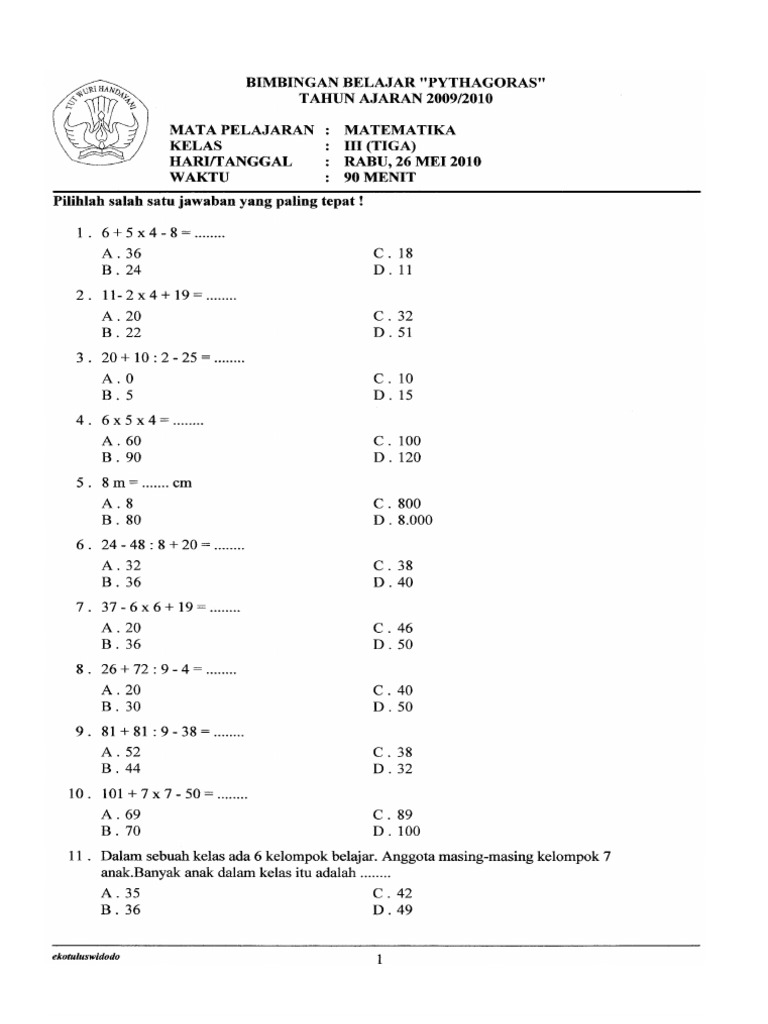 Latihan soal ulangan matematika kelas 3 sd tahun pelajaran 2016