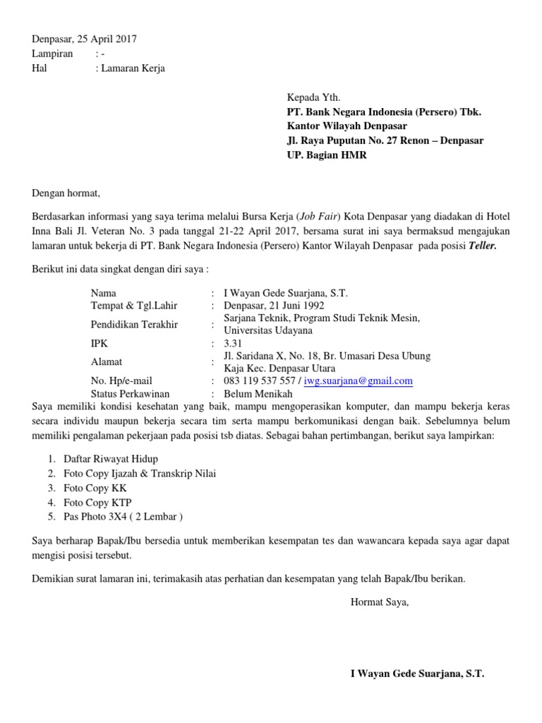 DOC) Contoh Surat Lamaran Kerja Bank BNI | Muhammad Arya Mandagi …