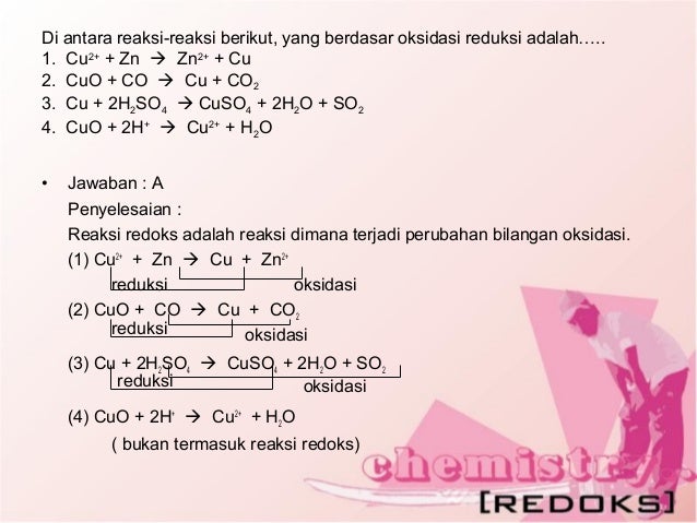 1. Reaksi berikut yg merupakan reaksi redoks adalah…. A. H2 + CuO => Cu + H2O B. SO3 + H2O - Brainly.co.id