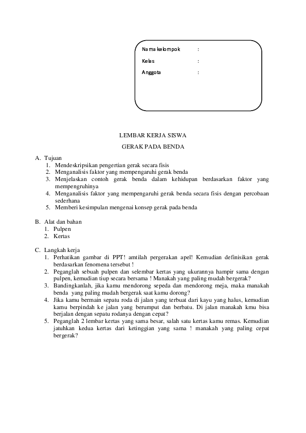 Web viewGaya Gesek Membandingkan gerak benda pada permukaan yang berbeda-beda (kasar, halus). Menjelaskan - [DOC Document]