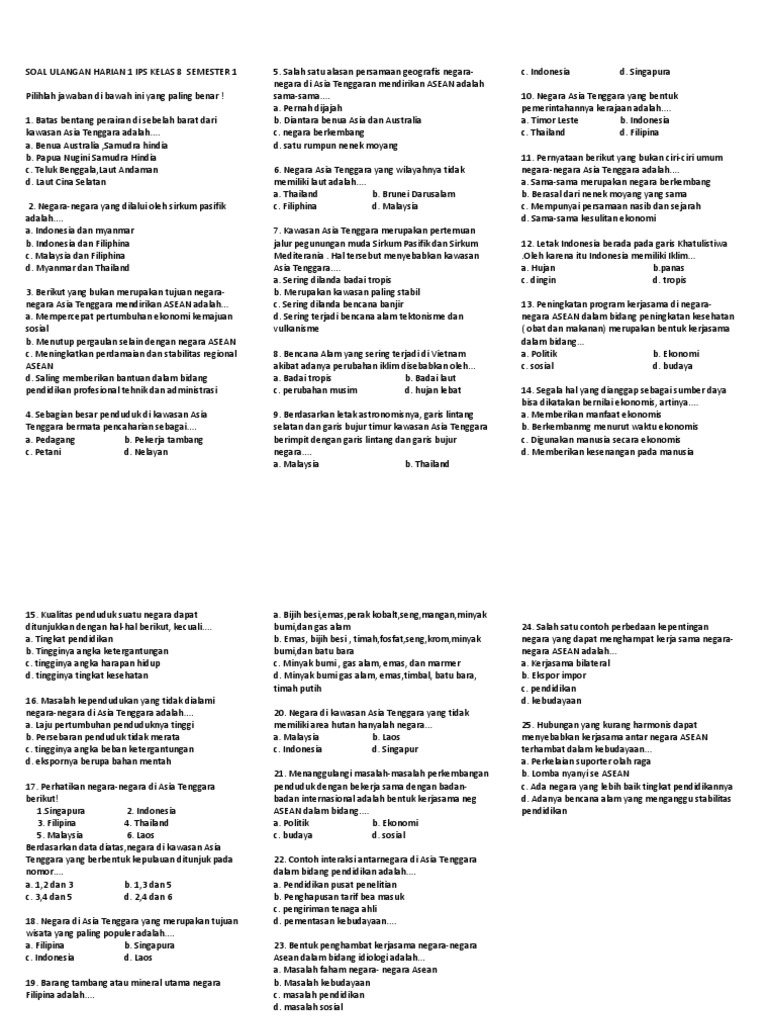 Soal Penilaian Harian IPS Kelas 8 Semester 1 Materi Negara ASEAN …