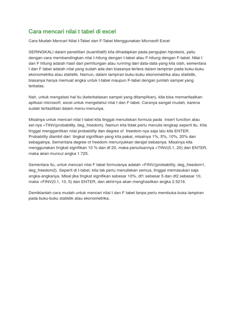 Cara Membaca atau Melihat Tabel T dengan Excel - Portal Statistik