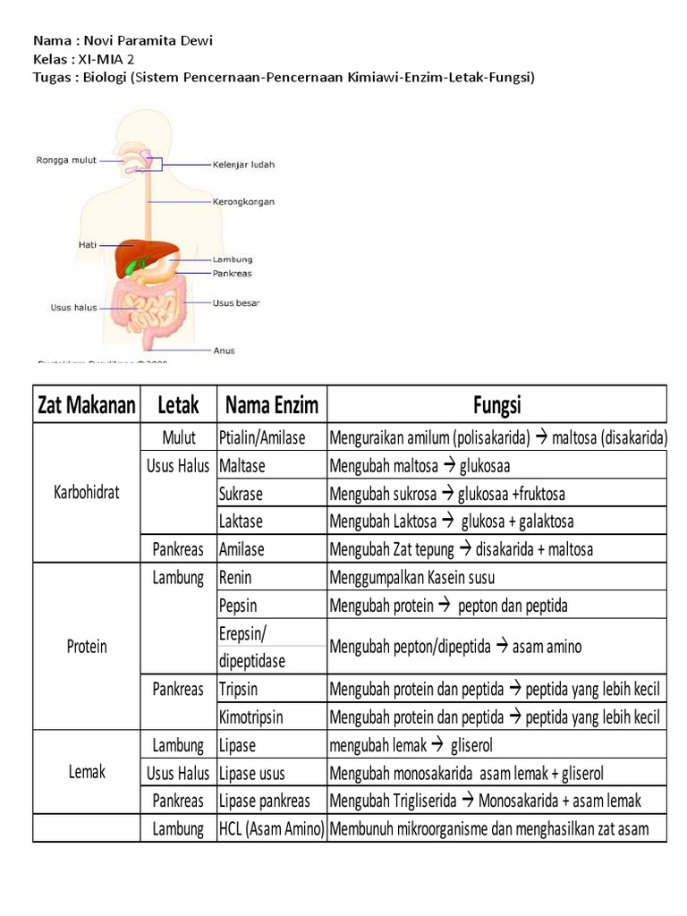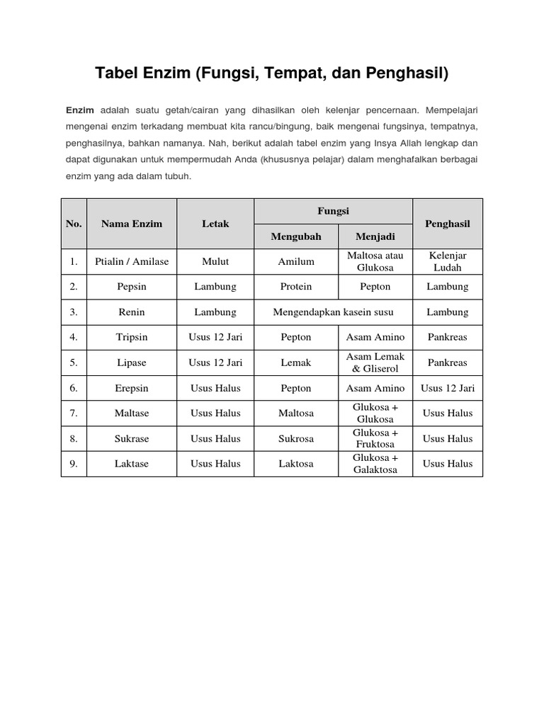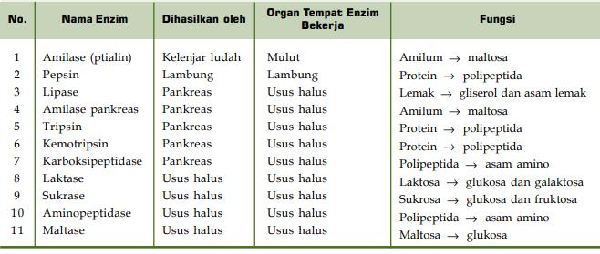 sebutkan nama enzim beserta asal, tempat bekerja dan fungsinya! - Brainly.co.id