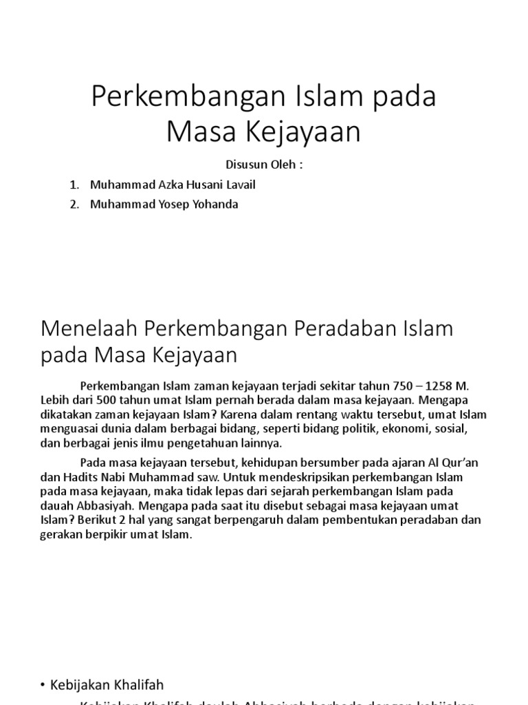 Perkembangan Islam pada Masa Kejayaan: Disusun Oleh: 1. Muhammad …