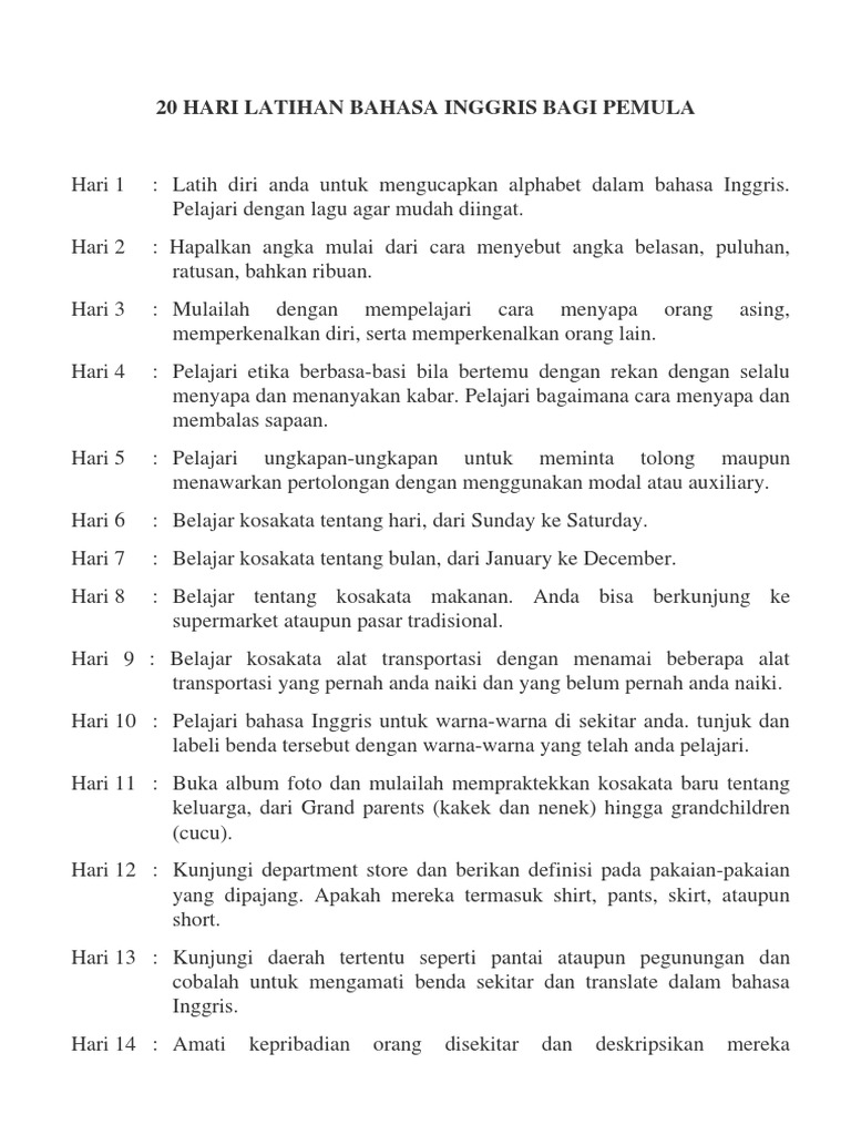20 Hari Latihan Bahasa Inggris Bagi Pemula